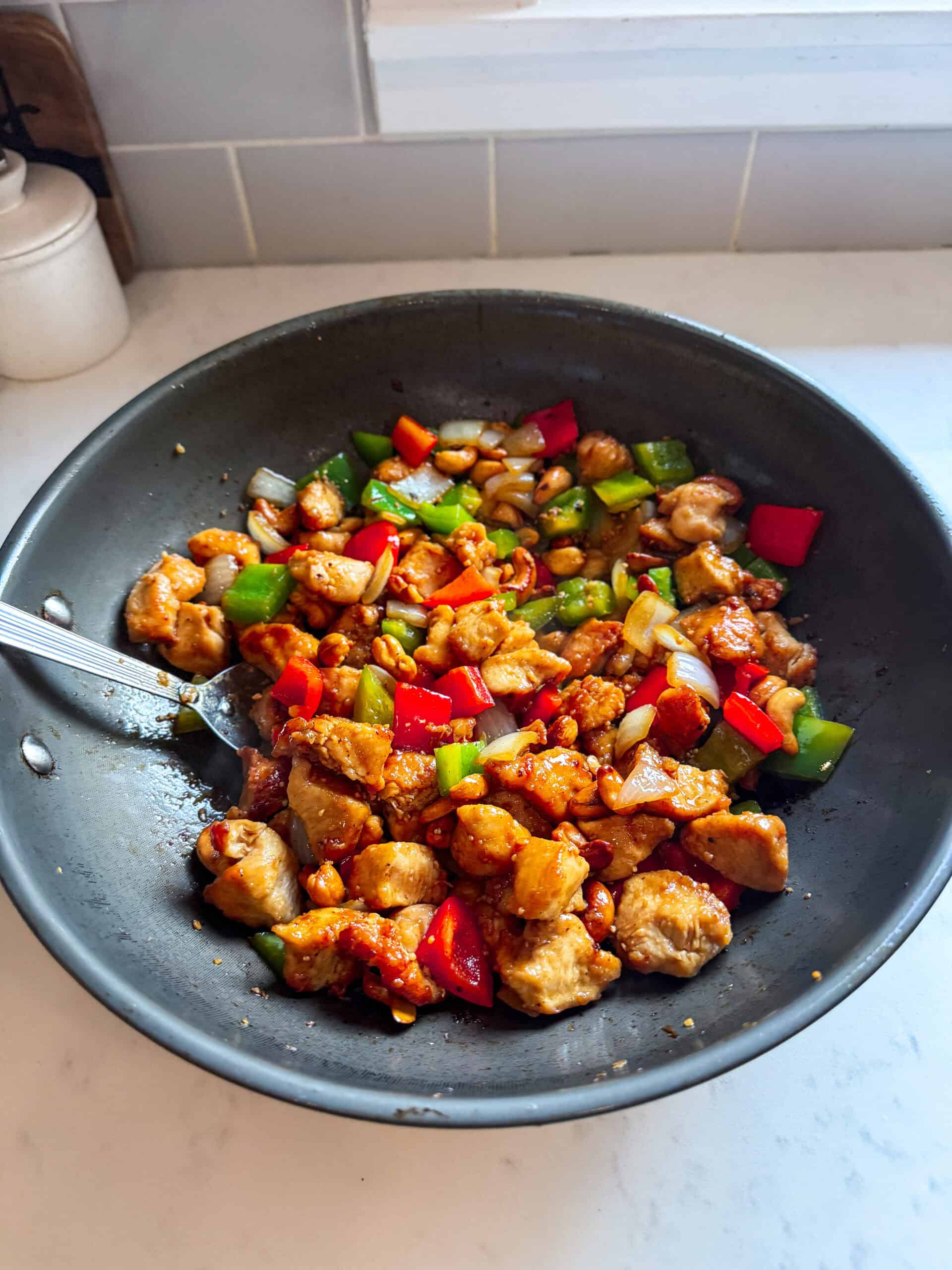 Everything cooks quickly in a wok or large skillet, keeping the vegetables crisp and the chicken tender, exactly what makes this dish taste like restaurant cashew chicken at home.
