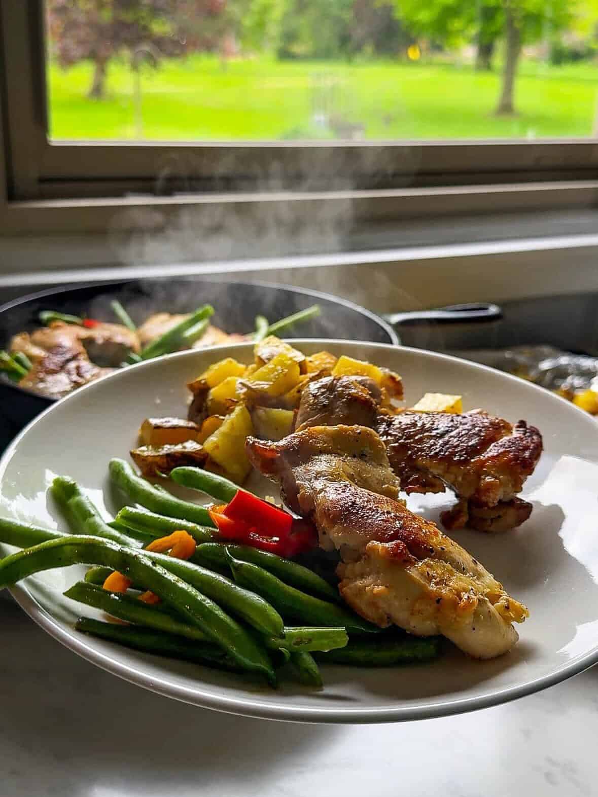 One Pan Cast Iron Chicken Thighs with Green Beans and Peppers