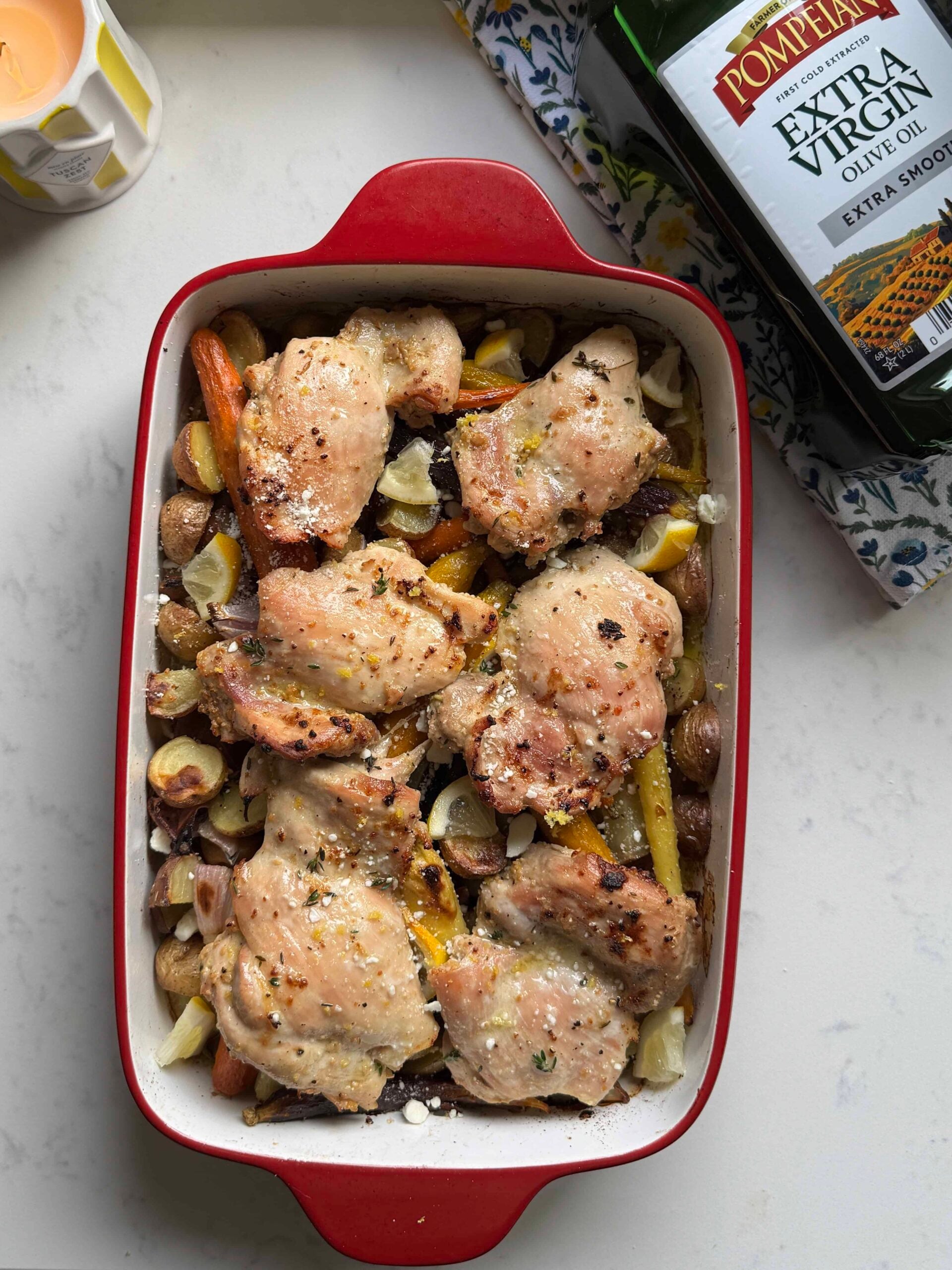 Overhead view of one pan chicken thighs and veggies with baby potatoes, rainbow carrots, red onion, lemon, thyme, and feta