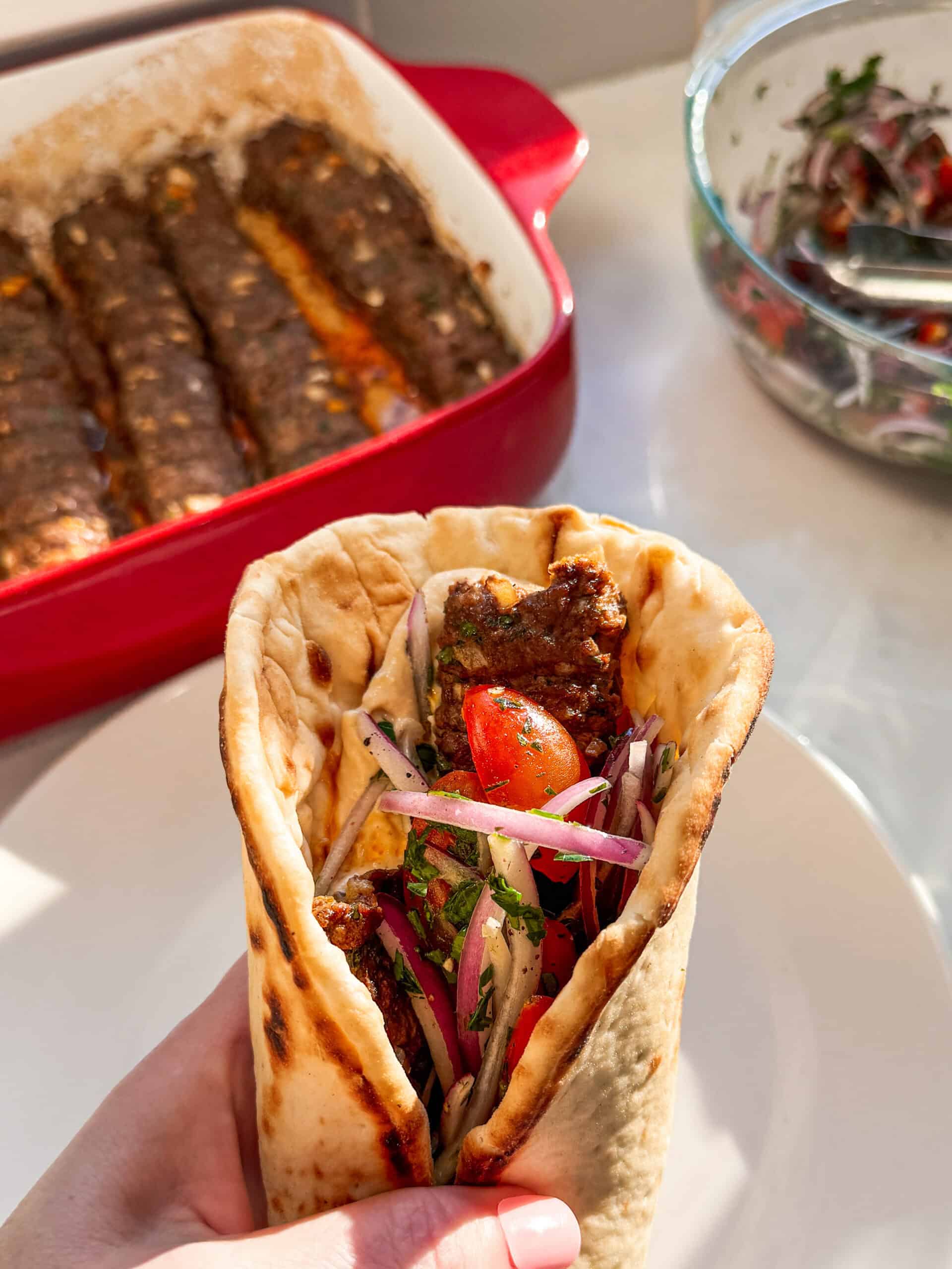 Ground beef kofta pita sandwich with tomato onion salad and hummus on a white plate with oven baked kofta in a casserole dish in the background