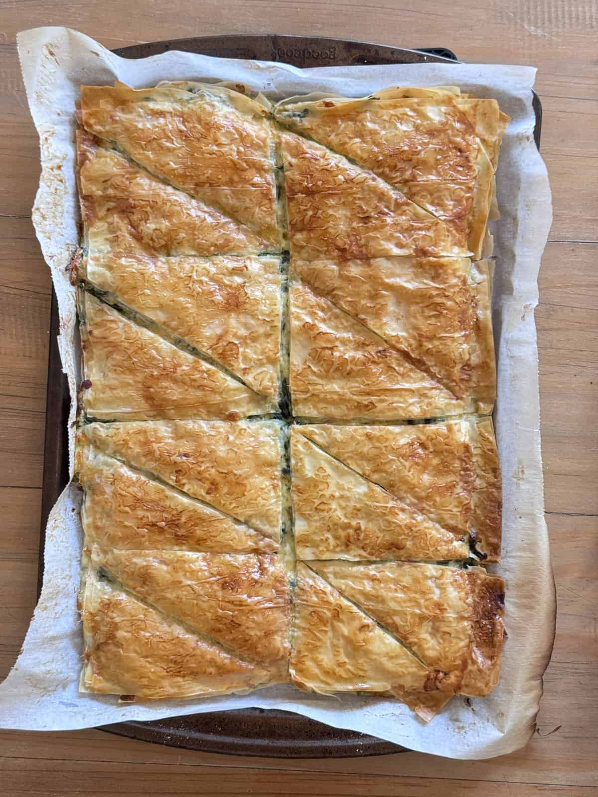 She made this flaky, cheesy spinach pie for nearly every gathering. It was always baked in big trays — one for now, two for the freezer. The smell of buttery phyllo, savory onions, and warm cheese still feels like home.