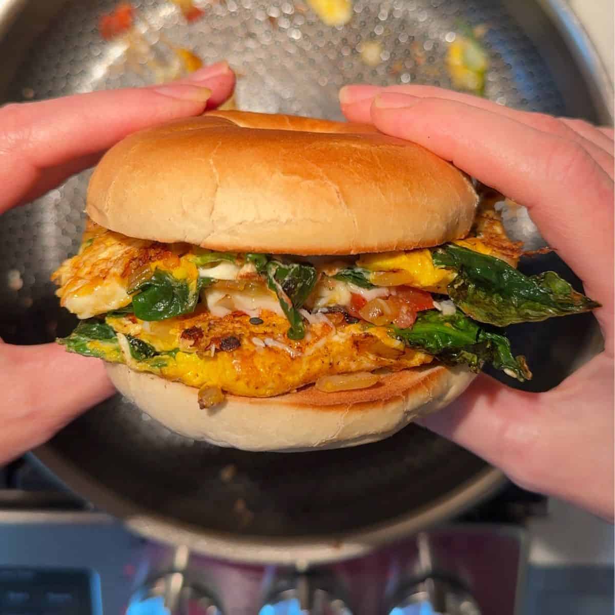 Toast your bagel or English muffin. Pile the egg scramble onto the bottom half, top with the other half, and enjoy warm!